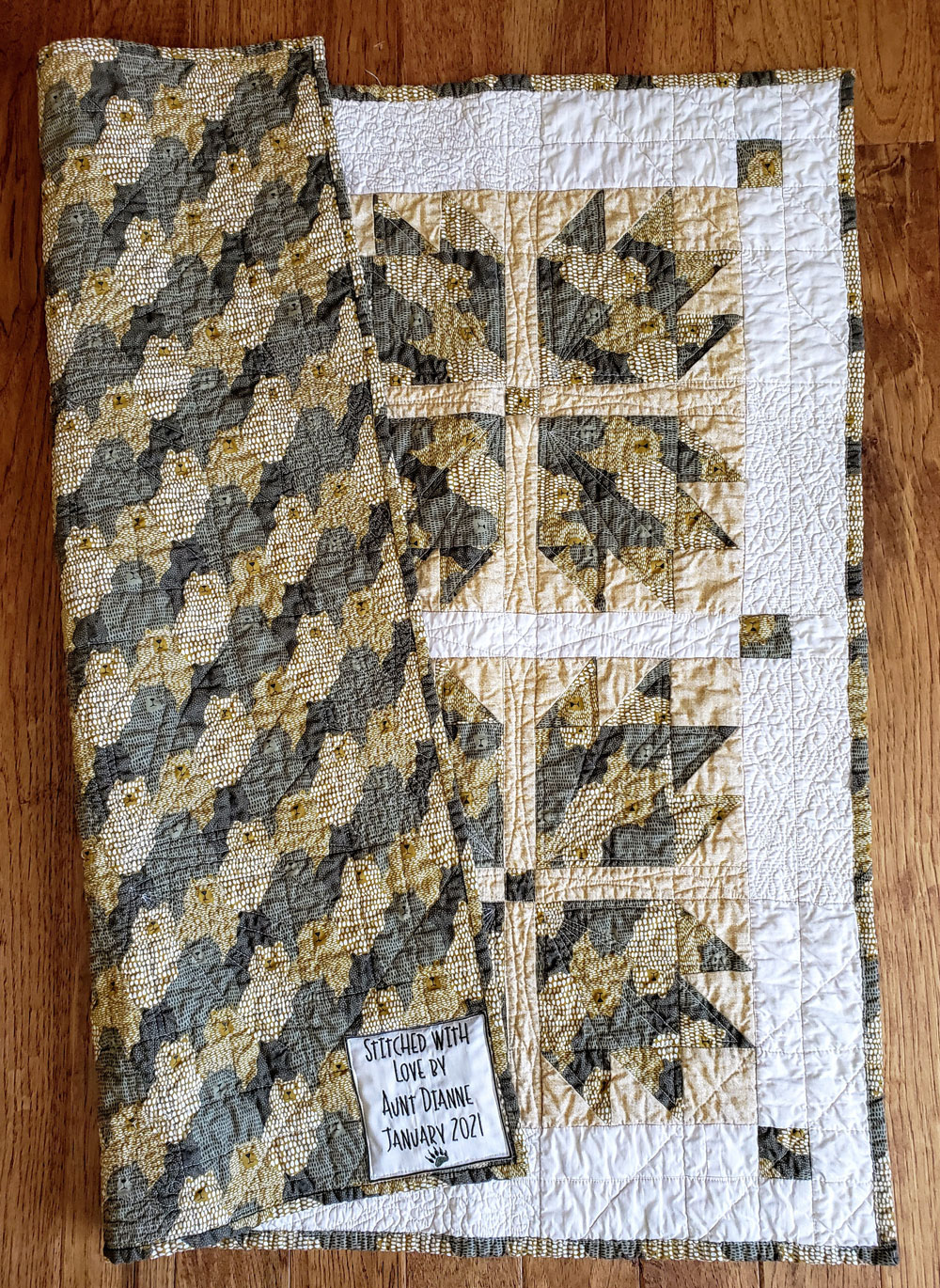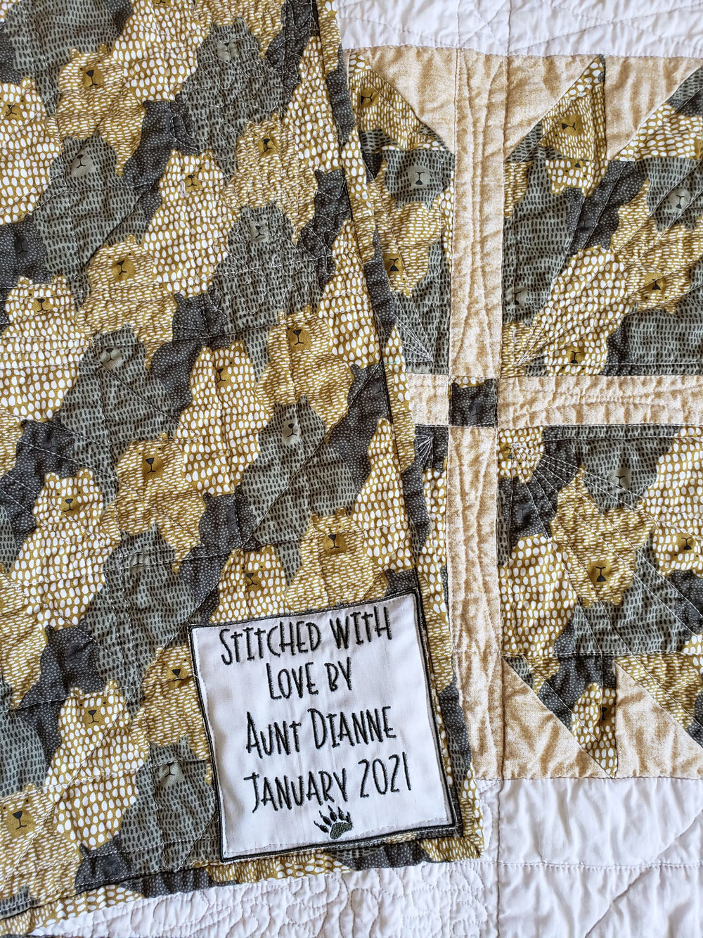 The bear fabric is from Moda, the white fabric is actually a white and tea-stained-looking fabric from Island Batiks and the tan fabric is from the Quilter’s Candy line at Connecting Threads. The machine embroidery on the sashing is flanked on each end with an embroidered bear paw and the label on the back also features a bear paw. I’m not great at free-motion quilting, but the more I do it the better it looks. This was my best attempt at a quilting meander that I’ve done, to date. There are four meander sections, one on each side of the border. Most of my quilted bear paw points look great, but a few could have been better—but I don’t think little Mac is going to care one bit!