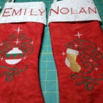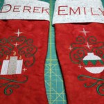 Once I had the backs cut, I created the embroidery files for each stocking front. I had the filigree ornament embroidery designs on hand (I cannot remember from where I originally purchased them) and then added additional stars and swirls using Embrilliance Essentials embroidery software. The font for the names was one purchased from Designs by JuJu (which is where all my favorite BX fonts come from).