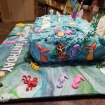 I used Wilton’s Sea Life silicone mold for the sea creatures. I also have a set of Wilton’s alphabet letters silicone molds that I’ve used for years that I used to create the words. The cake board is covered with fondant and the molded sea creature shapes are also made from fondant. The other decor came from a mermaid sea life cake set purchased from Amazon. Her sparkly heart-shaped candles came from Party City.