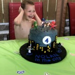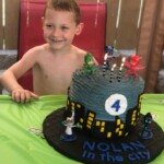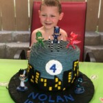 The scripts for the animated series always begin, “Night, in the city…” which is why there’s fondant lettering on the city/cake board that reads “Nolan, in the city.” I covered the cake board with black fondant that was marked up to look like asphalt. The four-layer white cake was colored dark blue and has blue-tinted almond buttercream between the layers and all around it. The city buildings, moon and lettering are all from fondant. All the PJ Masks characters were toys he could keep after the party. Nolan was a very happy boy, albeit a bit cold and wet having just exited the swimming pool at his party.