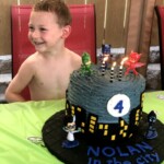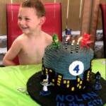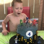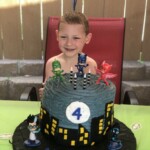 It’s always fun to make birthday cakes for my grandkids and my grandson, Nolan, requested a PJ Masks themed party and birthday cake. If you’re not familiar with the PJ Masks cartoon franchise, think Power Rangers for a younger audience. What could be better than kids becoming superheroes themselves? That’s what happens at night for young friends Connor, Amaya and Greg. When they put on their pajamas and activate their animal amulets, they turn into their alter egos—Catboy, Owlette and Gekko— before embarking on adventures that are filled with action. The three main characters of the series are on top of the cake with the candles and the two bad guys from the series are attached to the bottom of the cake board with frosting.