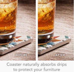 - Proudly Made In The USA of absorbent stone to absorb excess condensation from beverages. Attractive designs allow the coasters to remain displayed even when not in use.