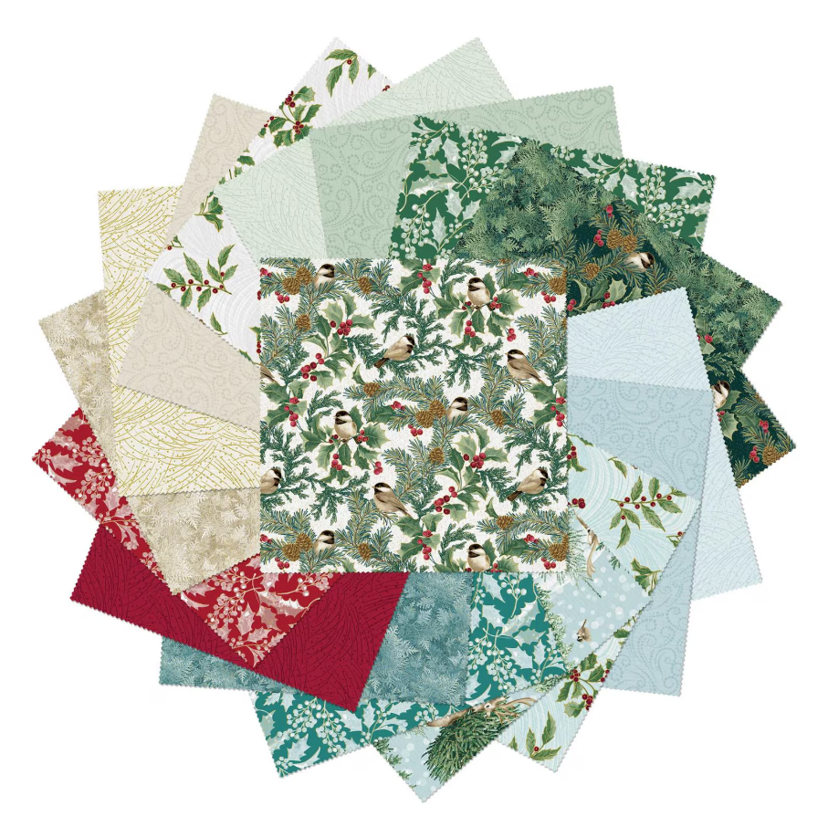 The panel, border stripe and large scale print all depict A Winter’s Day with sparkling snowflakes decorating the tips of the tree branches. With classic coordinates and her Wave Texture basics, this collection is sure to delight.