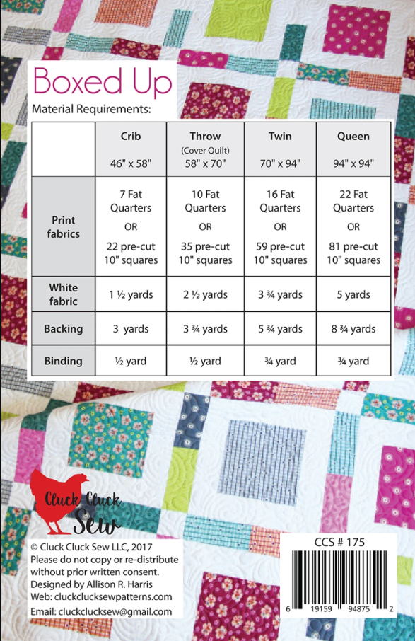 Allison Harris for Cluck Cluck Sew Boxed Up Quilt Pattern #CCS-175. Easy to make fat quarter or layer cake quilt in four sizes.