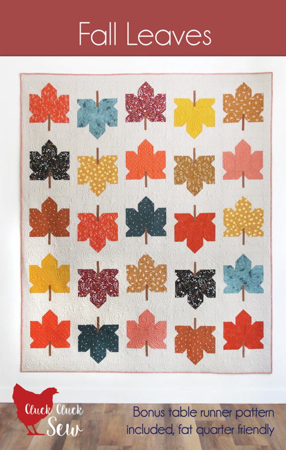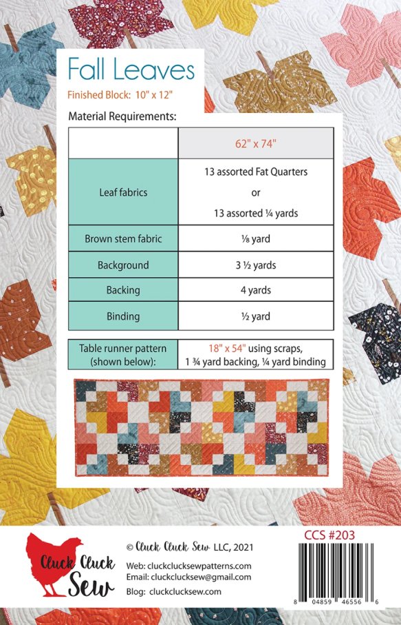 62in x 74in Fall quilt made with fat quarters or yardage. Also includes instructions to make a 18in x 54in table runner with the scraps!