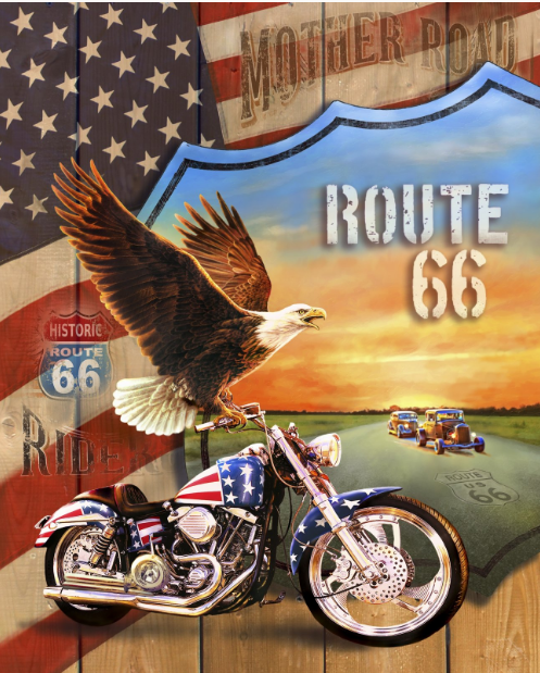 This panel features a patriotic motorcycle and an American Bald Eagle celebration on Route 66.