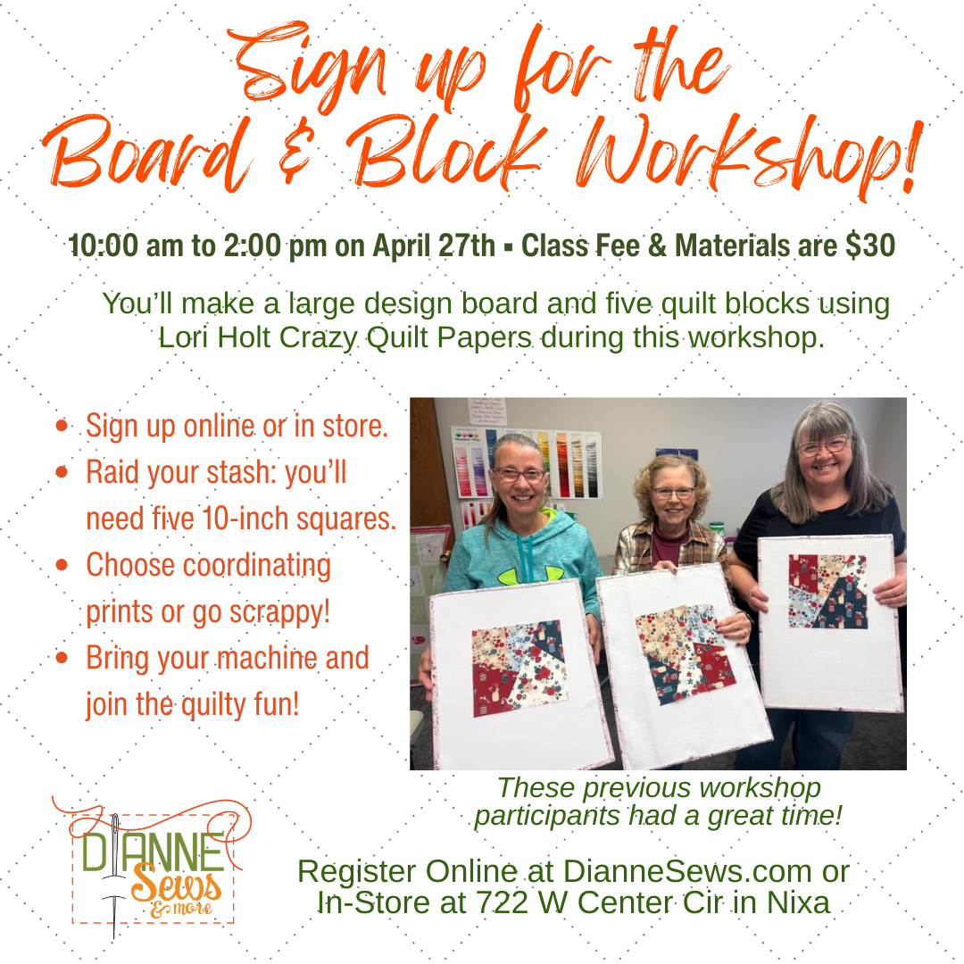 Board & Block Workshop April 27th from 10:00 am to 2:00 pm