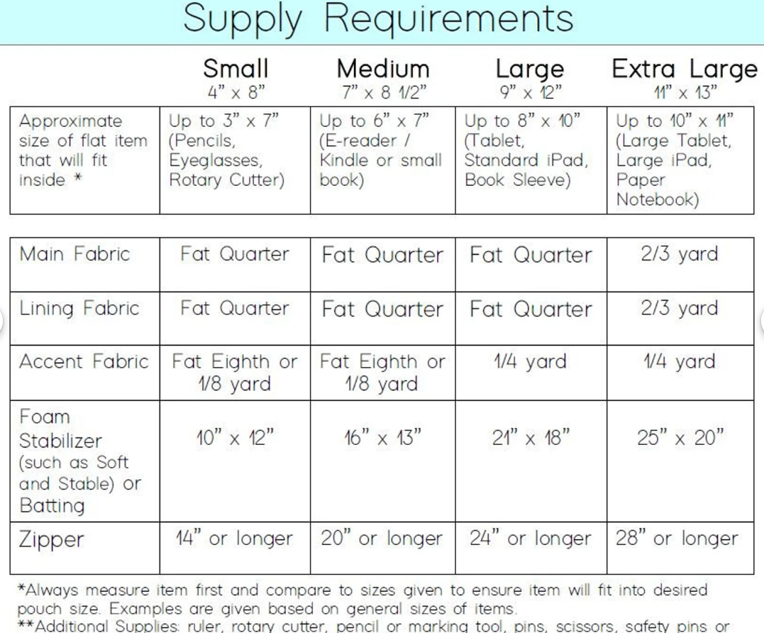 Quilted zipper pouch pattern in four sizes to make a book sleeve, tablet sleeve, pencil case, and eyeglasses case.