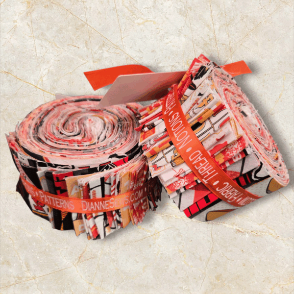 42 assorted fabric 2-1/2″ x WOF strips with fabric. Each 2.5″ strip set includes varied prints from Paintbrush Studio Fabrics’ “What a Catch” collections and Fabric Traditions KC Chiefs Retro black licensed print. No two strip sets are alike. There are no solids in the roll.