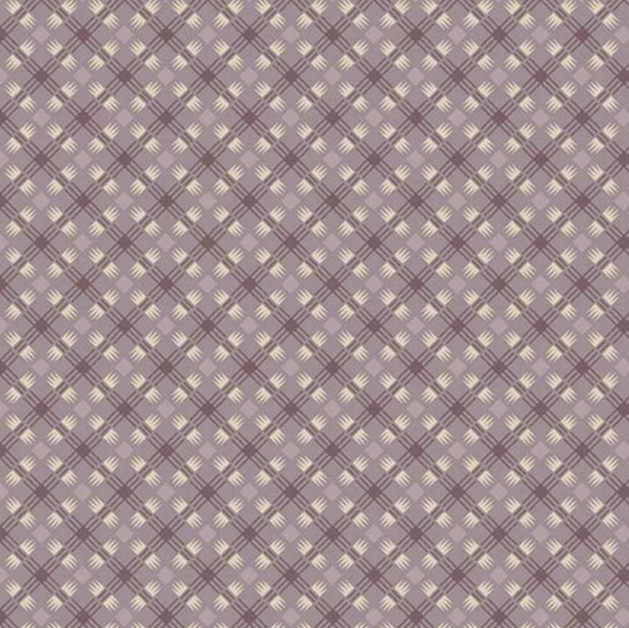 Dolores Smith of Timeworn Toolbox for Marcus Fabrics Flower Garden Geo Purple R541206D-PURPLE. Flower Garden combines warm sage and purple tones reminiscent of the flower gardens of Smith’s childhood. The collection features pale purples and grays.