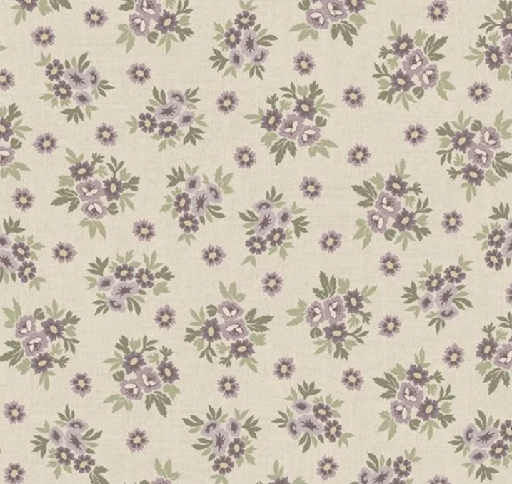 Dolores Smith of Timeworn Toolbox for Marcus Fabrics Flower Garden Small Bouquets Cream R541202D-CREAM. Flower Garden combines warm sage and purple tones reminiscent of the flower gardens of Smith’s childhood. The collection features pale purples and grays.
