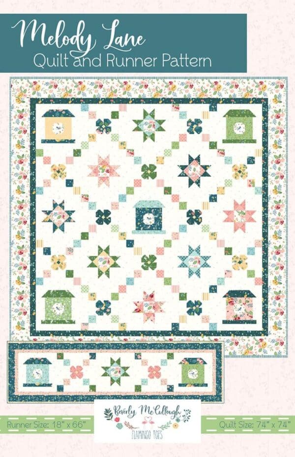 Melody Lane Quilt by Beverly McCullough of Flamingo Toes features pieced birdhouses, stars, and flowers in a chain setting. We have all the fabrics in this collection in stock.