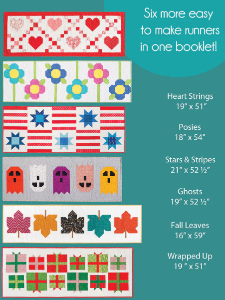 Volume 2 of the Modern Holiday Table Runners booklet includes 6 more beginner-friendly runner patterns. With small cuts of fabric and minimal space needed, these are a perfect, quick project that can be done anywhere.
