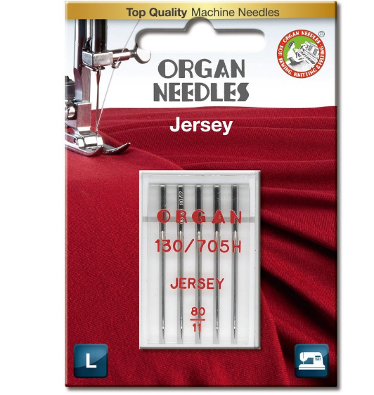 Organ Jersey Needles are ideal for sewing on fine/stretchy knit materials. The 130/705H needle system is compatible with most home sewing machines. Please consult your sewing machine’s instruction manual for compatible needles. This package of five Jersey Needles is available in sizes 70/9, 80/11, 90/14, 100/16, and Assorted 70-100.