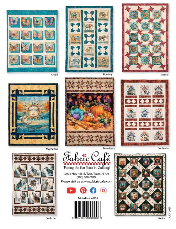 Take a quilting journey around the world with Panel Perfect 3-Yard Quilts, a collection designed to celebrate your favorite fabric panels. Each quilt is named after a unique location to embody the essence of the quilt. Patterns are written for full-yard panels, 10″ panel blocks, 8″ panel blocks, and 7″ panel blocks. All 8 patterns are directional fabric friendly in the fabric #1 position.