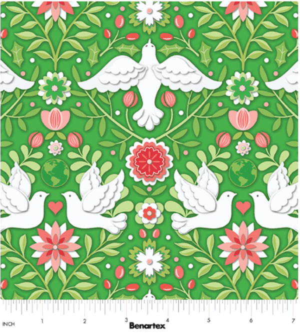 The Peace on Earth Holiday collection by Amanda Murphy for Benartex is a charming collection featuring imagery of white doves of peace, winter flowers, swirling vines, and subtle tonal globes incorporated into the pattern, conveying a message of peace.