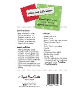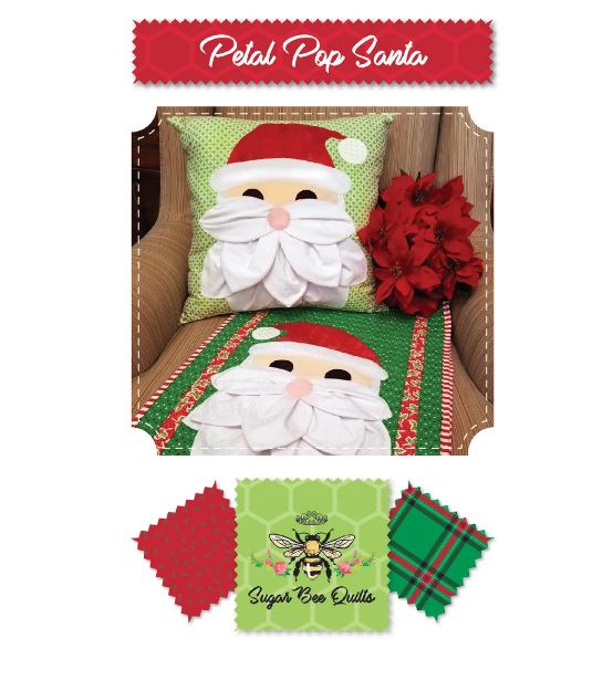 The Petal Pop Santa pattern provides instructions for both a pillow and a table runner. The pattern includes a paper petal template, but this pattern was designed to work with the acrylic Petal Pop Petal Template (SBQ02). Look for other Petal Pop projects and other patterns by Sugar Bee Quilts—pattern designed by Jeana Culbert.
