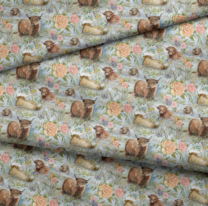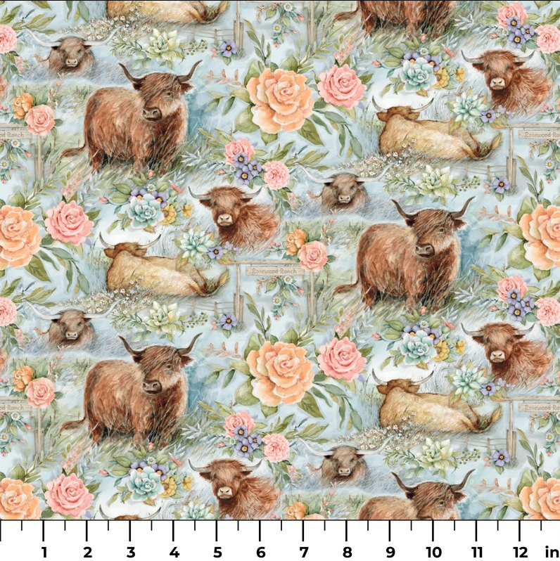 Susan Winget for Premium Quilting SW Highland Ranch Cow Ranch 2035-0625. Collection features Highland cows, cowboy boots, cowboy hats, florals, and Aztec patterns. High quality fabric perfect for quilting and decor projects.