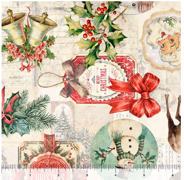 Vintage Christmas ephemera tells a story of holiday celebrations from days gone by. The collection includes a 36” Santa panel, picture patches, allovers, snowflakes, and a candy cane stripe are rendered in antique Victorian fashion that will bring you back in time. Spread the joy with quilts, home décor, and accessories for yourself or a loved one.