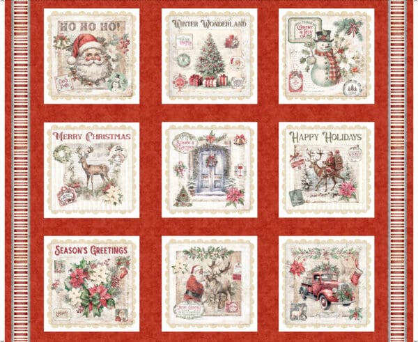 Vintage Christmas ephemera tells a story of holiday celebrations from days gone by. Picture patches, all-over prints, snowflakes, and a candy cane stripe are rendered in an antique Victorian fashion that will transport you back in time. Spread the joy with quilts, home décor, and accessories for yourself or a loved one.