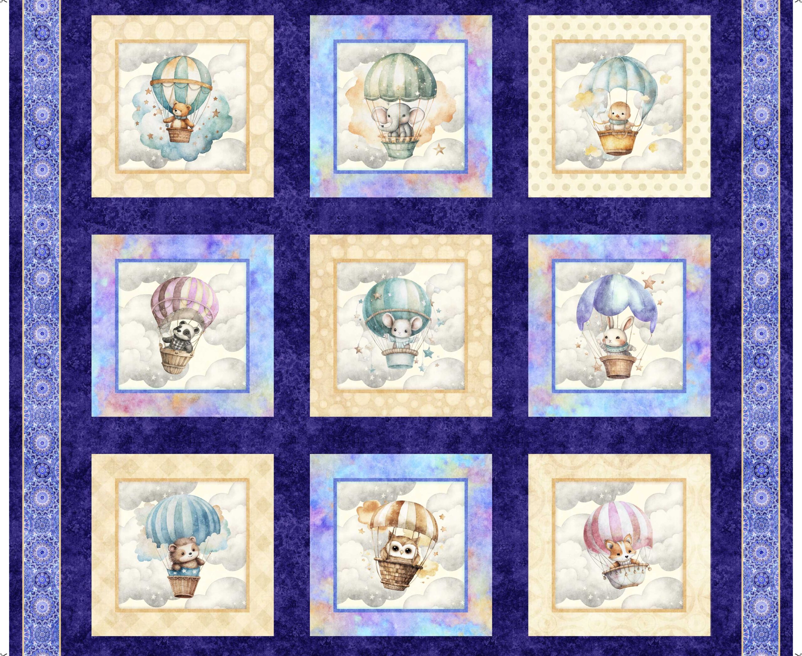 An adorable menagerie of animal friends in hot air balloons fly high in the sky and will take your little one to a dreamland. Soft, warm hues of blue, lavender, gray, and white anchor the whimsical design of this sweet collection. A perfect choice for a child’s nursery, baby accessories, and sweet apparel. ©Morris Creative Group