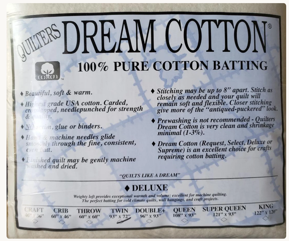 • With 100% natural, environmentally friendly cotton, Dream Cotton Batting proudly bears Cotton Incorporated’s black seal.