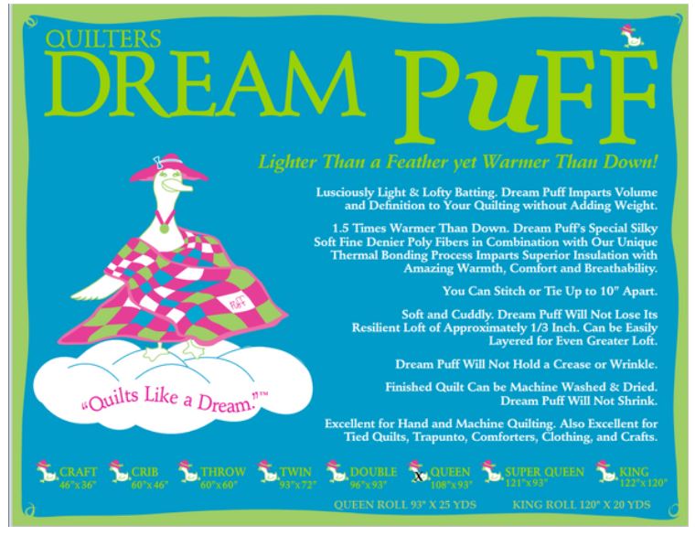 Contact us for customized pricing on larger bolt and roll sizes of Quilters Dream Batting. Larger sizes include a Queen Roll 93” x 30 yards or King Roll 120″ x 30″