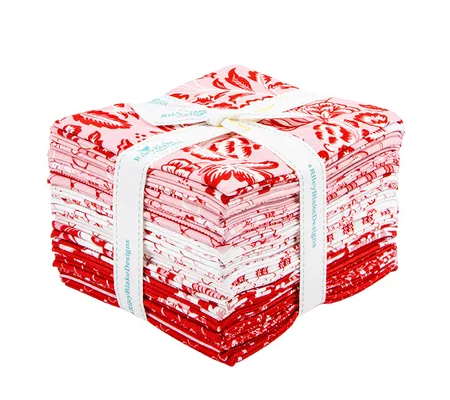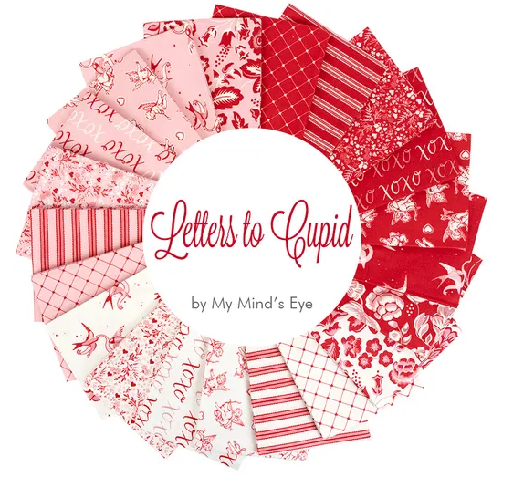 This Fat Quarter precut bundle includes 21 pieces from the Letters to Cupid collection by My Mind’s Eye for Riley Blake Designs.