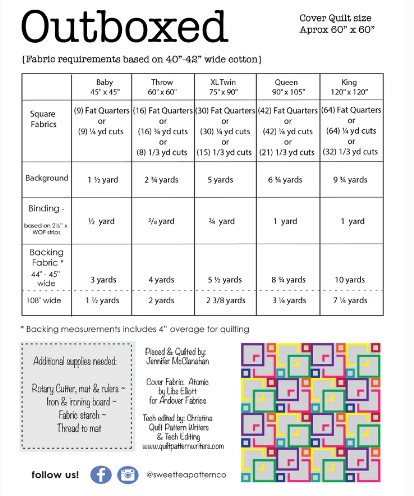 Step outside the box with Out Boxed—a modern, geometric quilt design that combines bold lines and clean structure with playful fabric combinations. This fat quarter friendly pattern is ideal for showcasing your favorite small prints or solids while keeping cutting and piecing simple and straightforward.