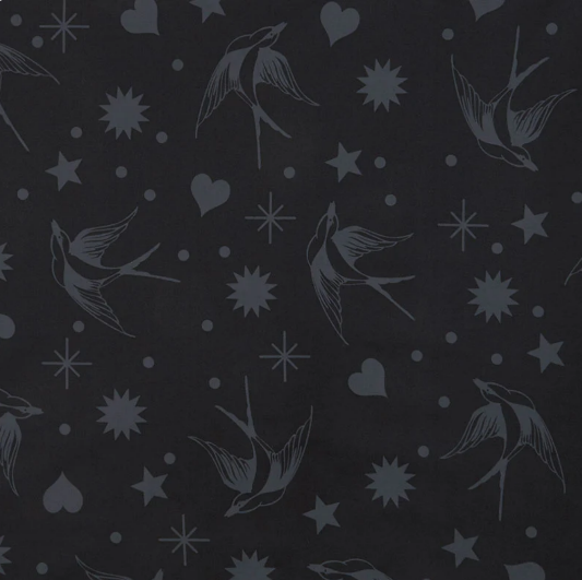 Grey birds, stars, dots, and hearts scattered across a black background.Cross the line into greatness with the Linework collection! These fabrics featuring geometric, floral, and abstract patterns in monochrome colors will make your next project top of the line.
