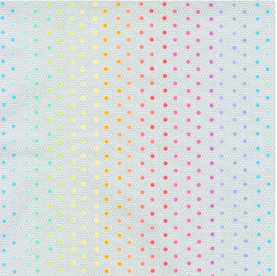 Hexy features echoed hexagonal shapes that blend together to create a unique repeating pattern. Gray outline with centers that change color throughout the spectrum on a light gray background.